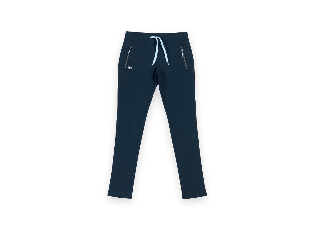 Dámské tepláky tmavě modré z příjemného materiálu (95 % bavlna, 5 % elastan) s bočními kapsami na zip, pružnou gumou v pase a stahovací šňůrkou.