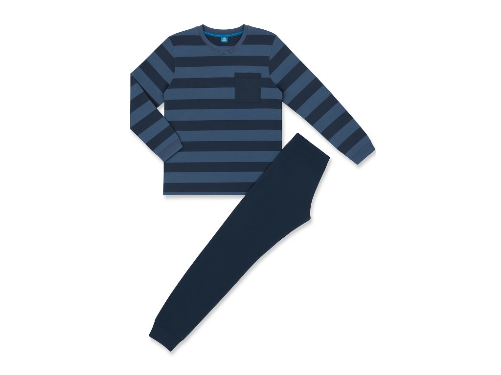 Chlapecké pyžamo z 100% bavlny s pruhovaným vzorem a kapsičkou na levé straně. Rukávy i nohavice do nápletu, v pase pohodlná pružná guma. Ideální pro klidný spánek.