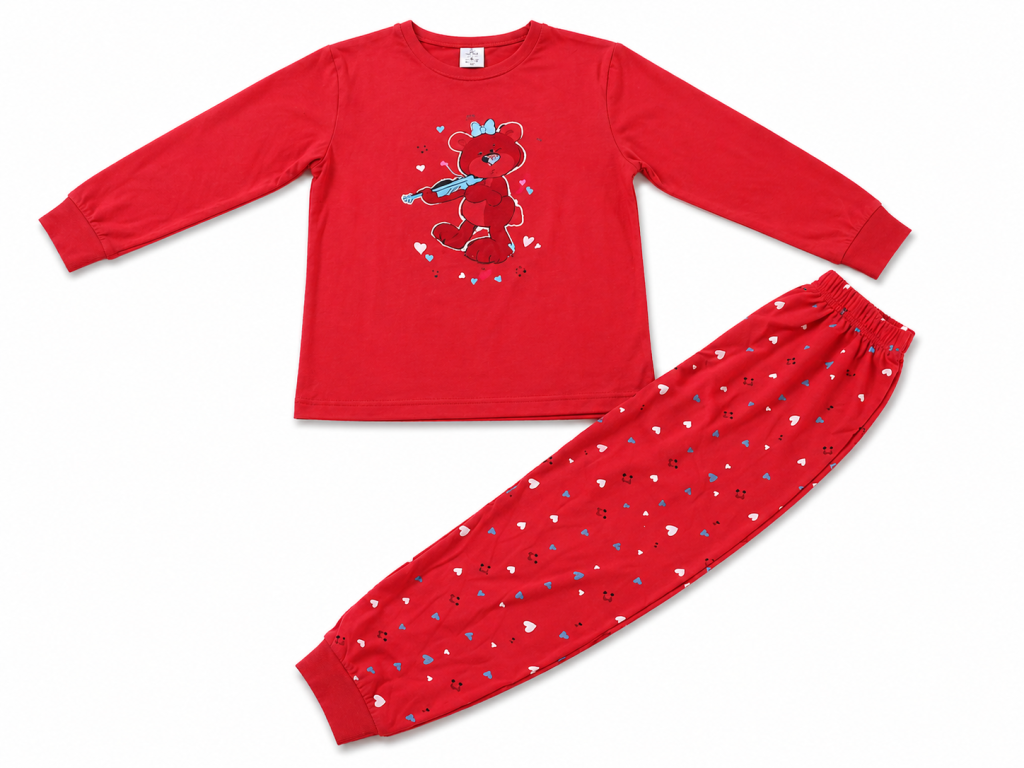 Pohodlné dívčí pyžamo z 100% bavlny s dlouhým rukávem a nohavicemi ukončenými do nápletů. Prodyšné, měkké a ideální pro klidný spánek.