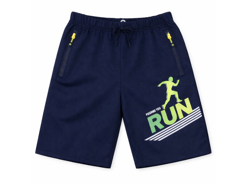 Dětské kraťasy RUN s pružnou gumou v pase, šňůrkou a kapsami na zip. Příjemný materiál 65 % bavlna, 35 % příměs. Pohodlné kraťasy na sport i volný čas.