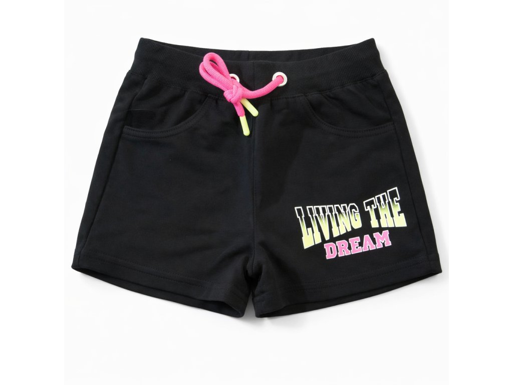 Moderní dívčí elastické kraťasy s krátkým pohodlným střihem, ideální na každodenní nošení i volný čas. Po stranách mají praktické kapsy a v pase jsou vybavené gumou se šňůrkou, která umožňuje snadné přizpůsobení a pohodlné nošení po celý den.