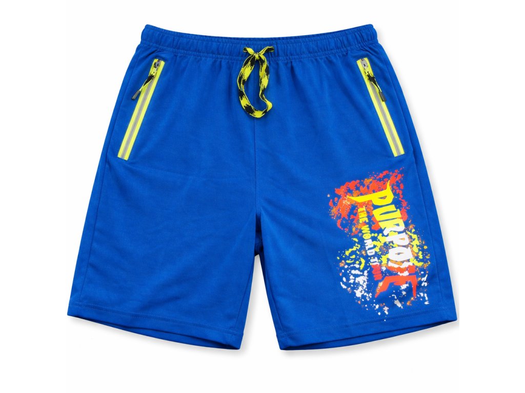 Bavlněné dětské kraťasy s kapsami na zip, reflexními prvky a moderním nápisem. Pohodlný elastický pas, ideální na sport i běžné nošení. Materiál 100 % bavlna.