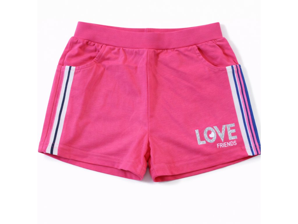 Stylové dívčí elastické kraťasy ideální pro každodenní nošení, sport i volný čas. Po stranách mají praktické kapsy a na levé spodní straně je moderní nápis LOVE FRIENDS, který dodává kraťasům módní vzhled.