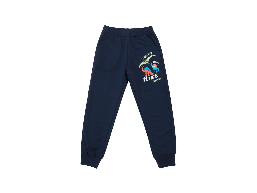 Hřejivé softshellové tepláky s jemným chloupkem, kapsami na zip a obrázkem dinosaura. Pohodlný střih, pružný pas a spodní lem do gumy.