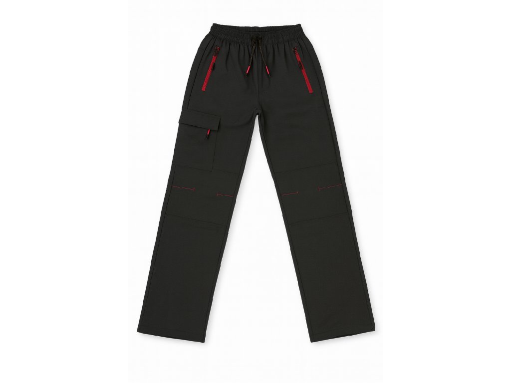 Šusťákové vyteplené tepláky s fleecem, stahovacími nohavicemi, reflexními prvky a kapsami na zip. Pohodlný pas se šňůrkou.