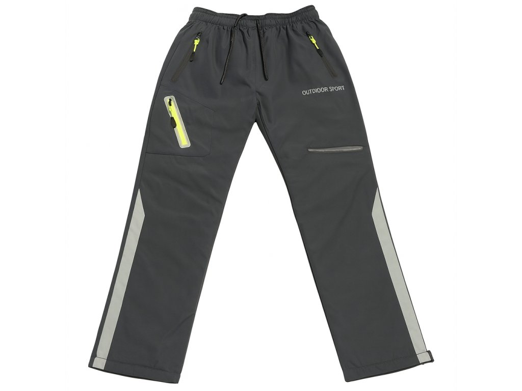 Bavlněné vyteplené outdoorové tepláky s hřejivým fleecem, kapsami na zip a pružným pasem se šňůrkou. Pohodlné a praktické do chladného počasí.