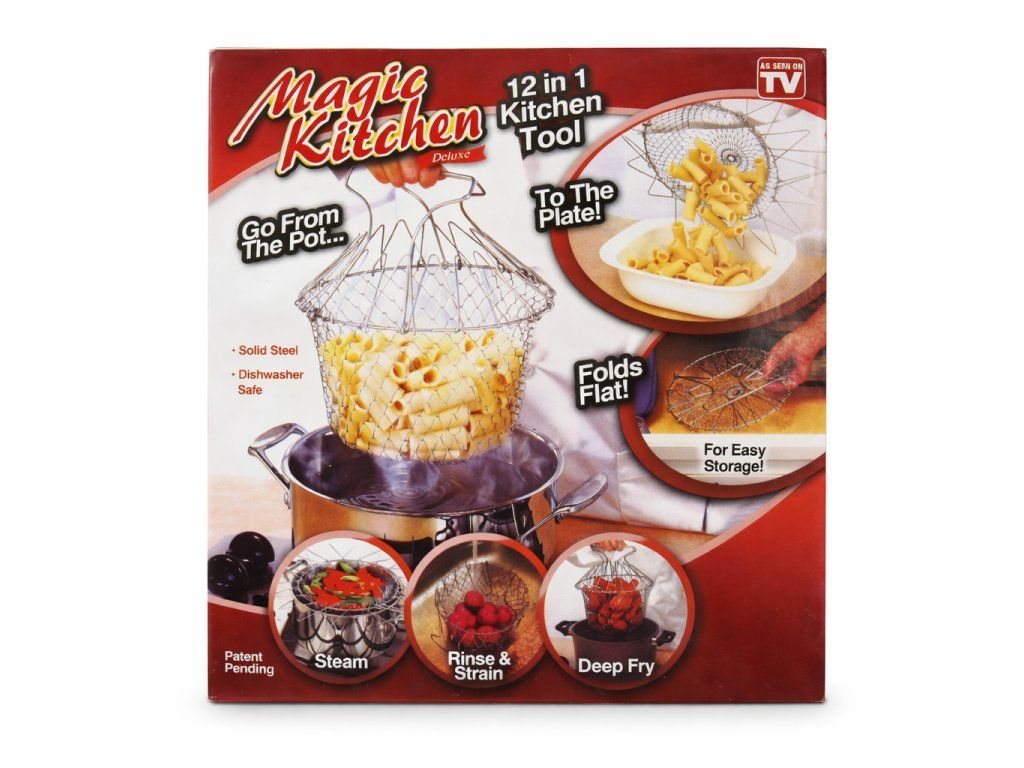 12 in 1 Kitchen Tool oceníte při přípravě těstovin, zeleniny, smažených i vařených pokrmů. Síto má průměr 23 cm a hloubku 11 cm, takže nabízí dostatek prostoru pro pohodlnou manipulaci s potravinami. Po použití jej snadno uložíte, protože je velmi skladné.