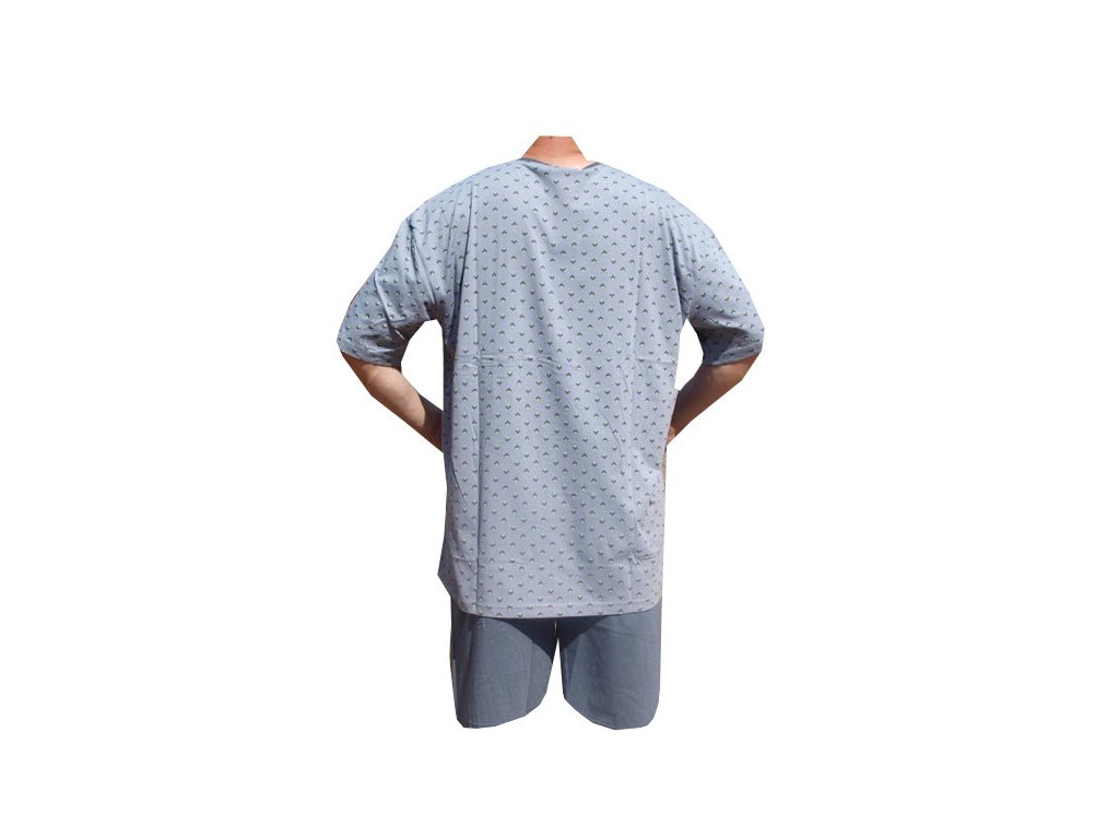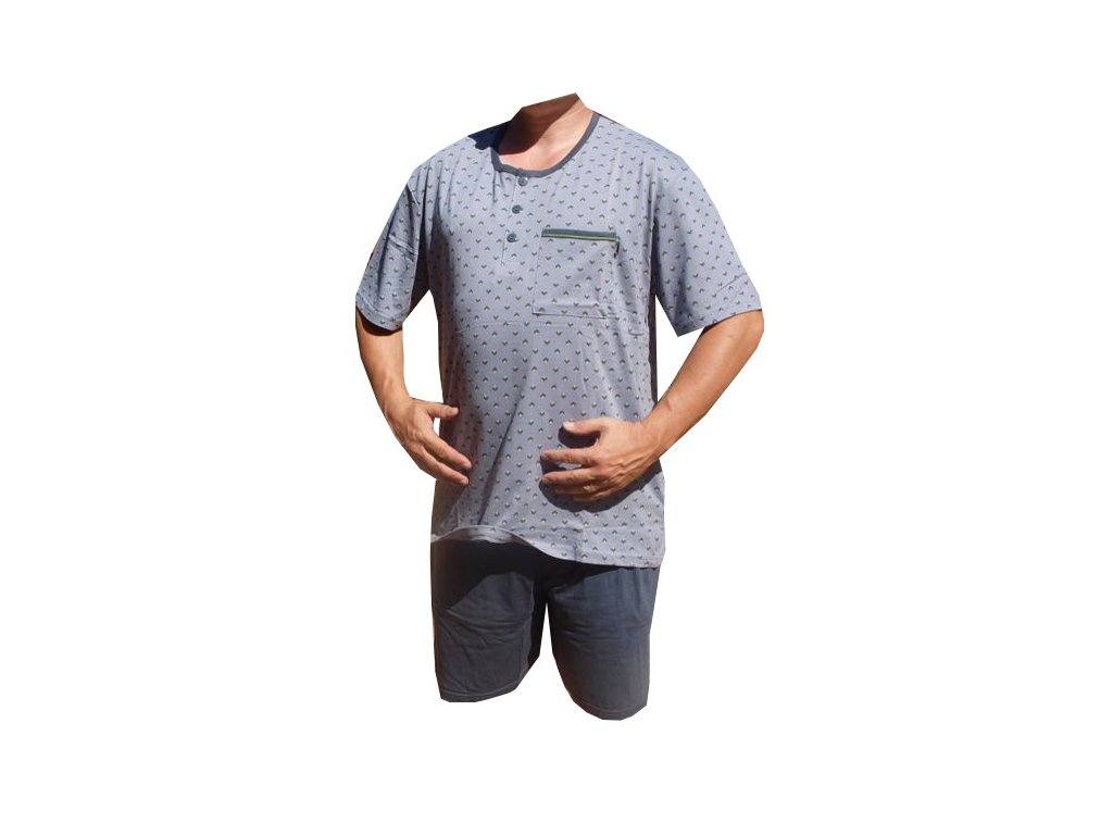 Pyžama bavlněné s krátkou nohavicí jsou vyrobené ze 100% bavlny. Výstřih u krku je do O se třemi knoflíčky. Pyžamový kabaték má na levé horní straně kapsičku. Pyžama jsou barvy šedé s drobným motivem .