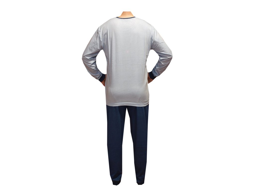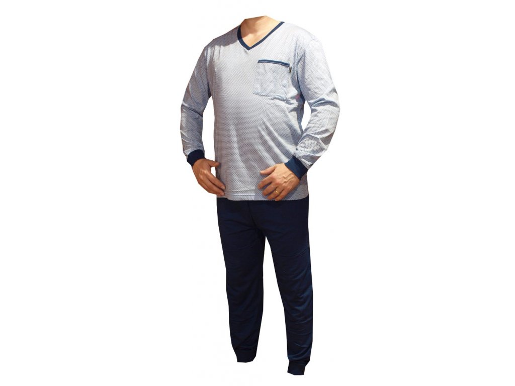 Pánské pyžamo bavlněné je barvy modré vyrobené z materiálu bavlna 100%. Pyžamový kabátek má v levé horní části kapsičku a rukávy ukončené náplety, Pyžamo je ukončené u krku výstřihem V. Kalhoty jsou v pase na pružnou gumu.