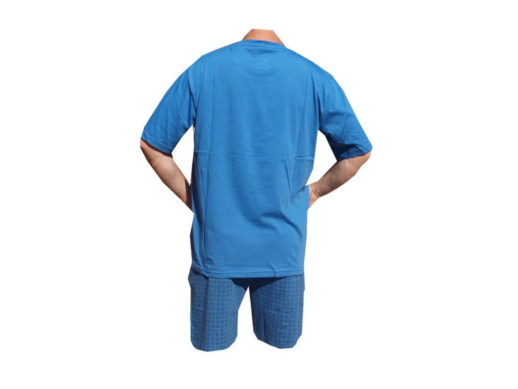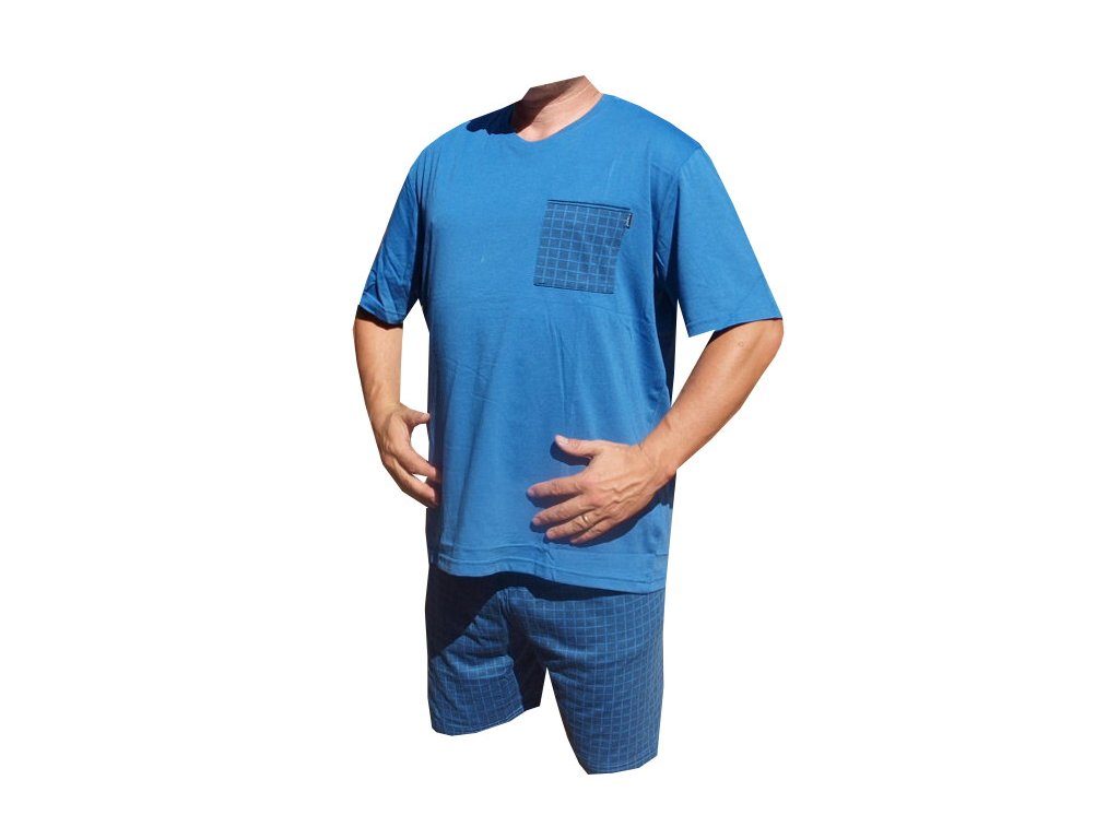 Pyžama bavlněné s krátkou nohavicí jsou vyrobené ze 100% bavlny. Výstřih u krku je do O. Pyžamový kabaték má na levé horní straně kapsičku. Pyžama jsou barvy modré.