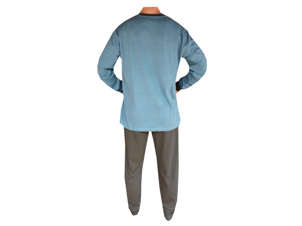 Pánské pyžamo bavlněné je barvy tyrkysové vyrobené z materiálu bavlna 100%. Pyžamový kabátek má v levé horní části kapsičku a rukávy ukončené náplety, Pyžamo je ukončené u krku výstřihem V. Kalhoty jsou v pase na pružnou gumu a ukončeny náplety.