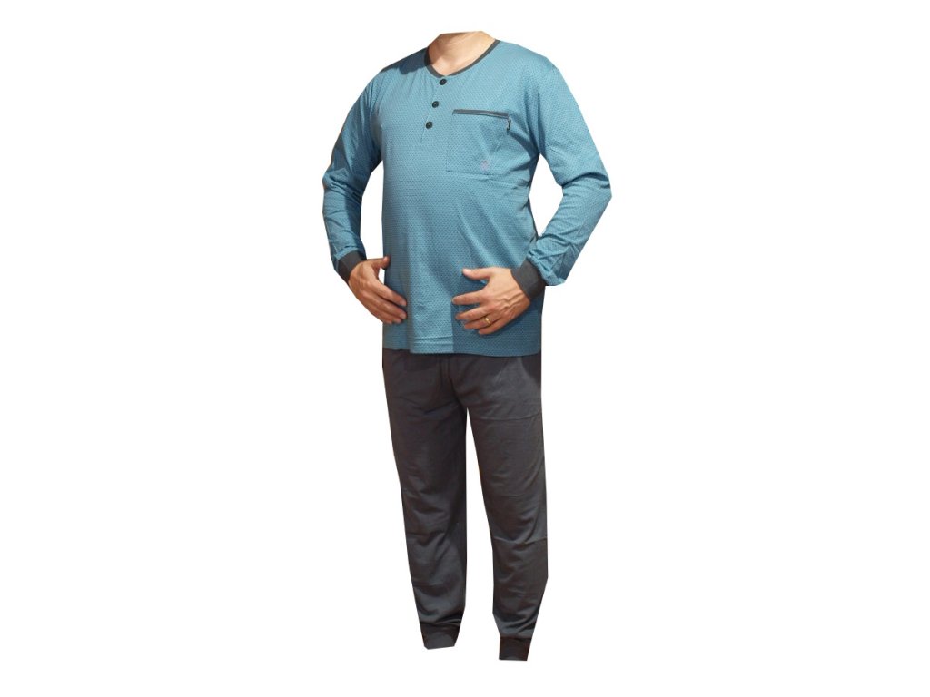 Pánské pyžamo bavlněné je barvy tyrkysové s drobným vzorem vyrobené z materiálu bavlna 100%. Pyžamový kabátek má v levé horní části kapsičku a rukávy ukončené náplety, Pyžamo je ukončené u krku výstřihem O s knoflíčky. Kalhoty jsou v pase na pružnou gumu.