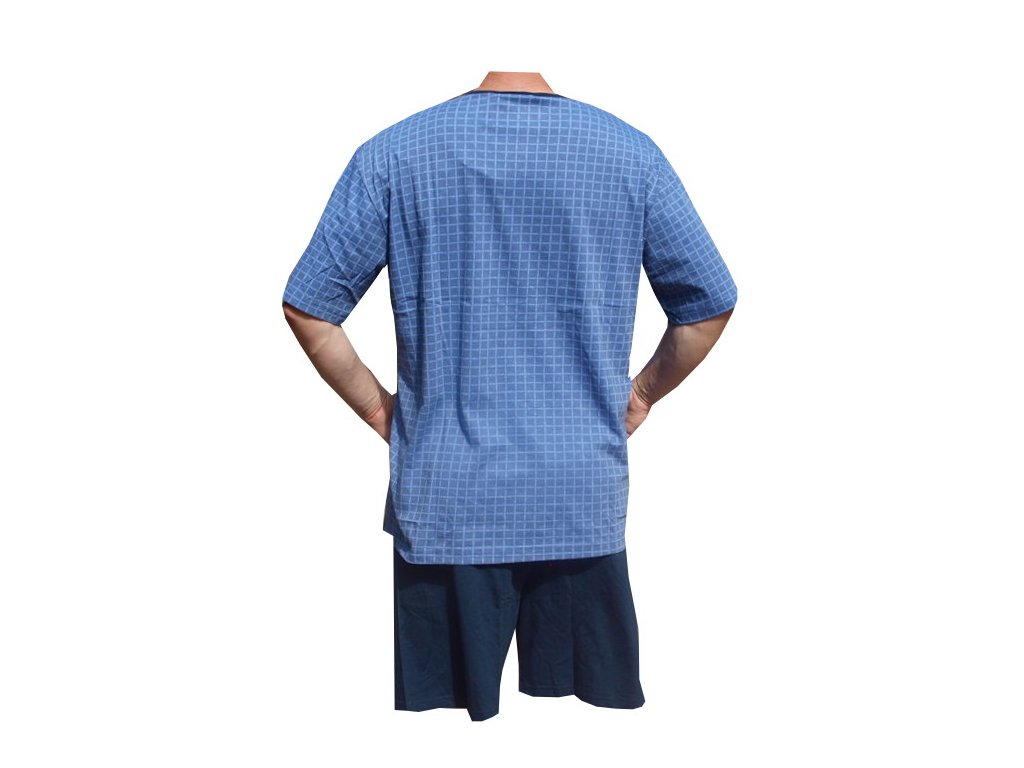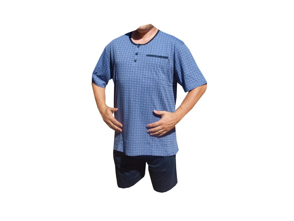 Pyžama bavlněné s krátkou nohavicí jsou vyrobené ze 100% bavlny. Výstřih u krku je do O se třemi knoflíčky. Pyžamový kabaték má na levé horní straně kapsičku. Pyžama jsou barvy modré.