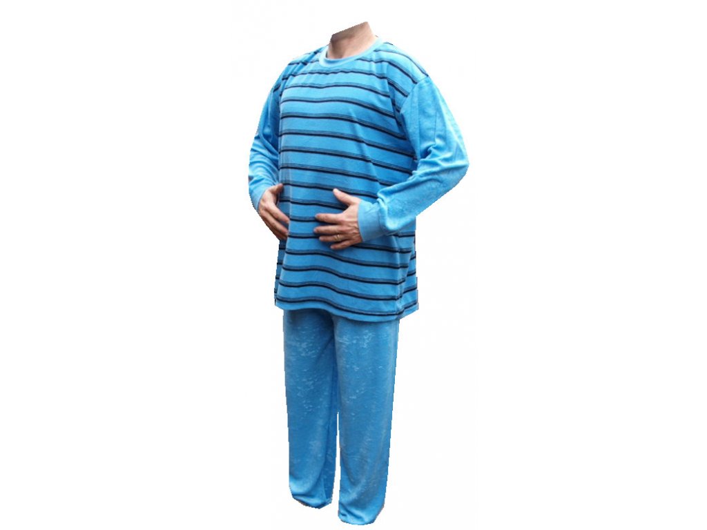 Pánské pyžamo froté hřejivé je barvy světle modré. Froté pyžama mají horní díl ukončen na rukávu s náplety, spodní díl je rovně ukončen. Pyžama jsou větší, při objednání doporučujeme objednat velikost o 1 číslo menší, než je velikost požadovana. Pyžamo je ukončené u krku výstřihem O . Kalhoty jsou v pase na pružnou gumu.