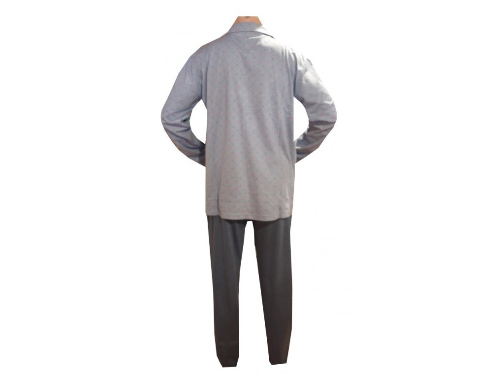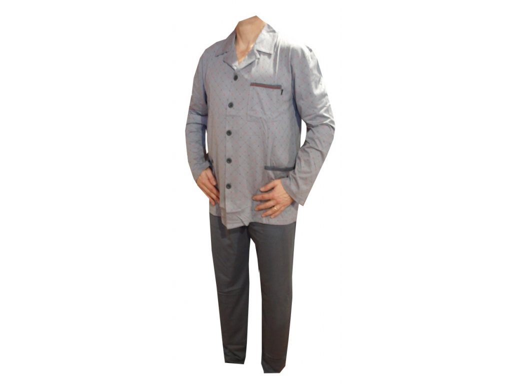 Bavlněné pánské pyžamo rozepínací je příjemné na nošení. Pyžamo má rozepínání na knoflíky a po stranách ve spodní části kabátku dvě kapsy, jedna kapsa je v horní části kabátku na levé straně. Kalhoty mají gumu v pase, končení nohavic je volné. Pyžamo je barvy šedé. Vyrobeno z bavlny 100%.