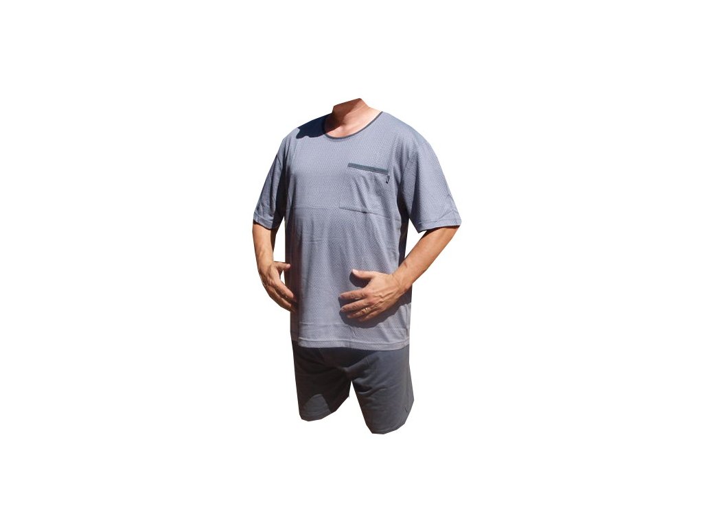 Pyžama bavlněné s krátkou nohavicí jsou vyrobené ze 100% bavlny. Výstřih u krku je do O. Pyžamový kabaték má na levé horní straně kapsičku. Pyžama jsou barvy šedé s drobným motivem .