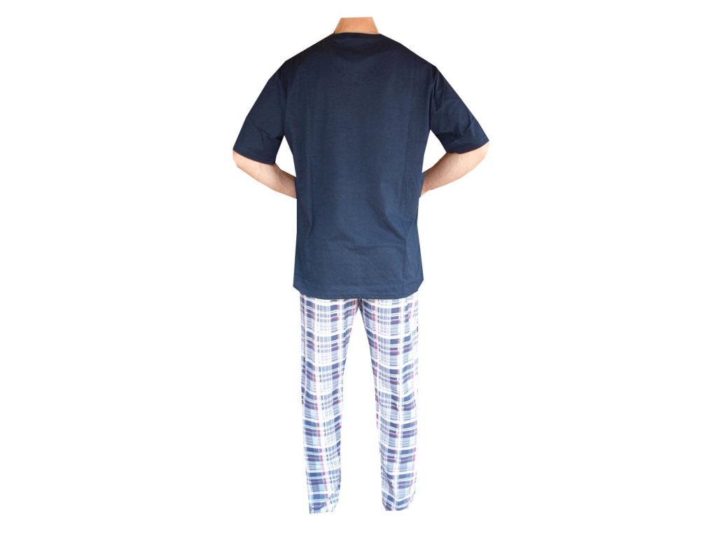 Pánské pyžamo bavlněné je barvy tmavě modré vyrobené z materiálu bavlna 100%. Pyžamový kabátek má v levé horní části kapsičku a krátké rukávy. Pyžamo je ukončené u krku výstřihem V. Kalhoty jsou v pase na pružnou gumu.