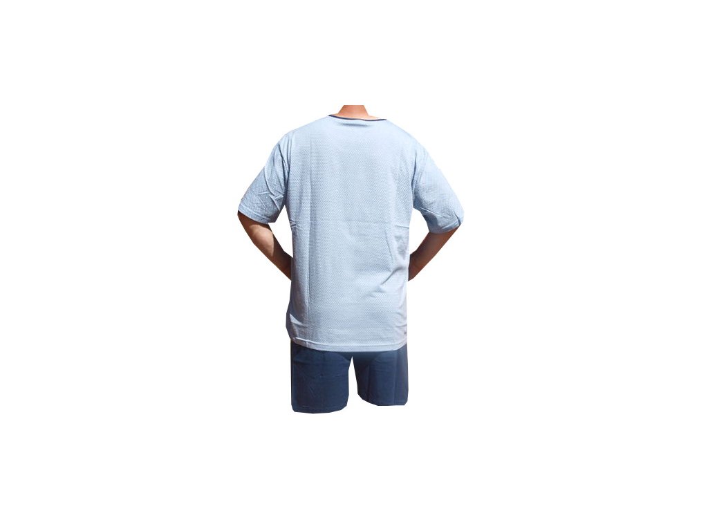 Pyžama bavlněné s krátkou nohavicí jsou vyrobené ze 100% bavlny. Výstřih u krku je do O. Pyžamový kabaték má na levé horní straně kapsičku. Pyžama jsou barvy modré s drobným motivem .