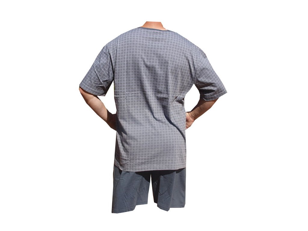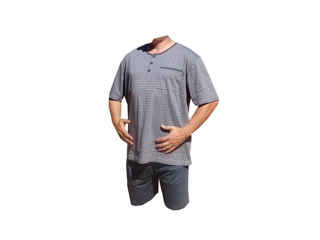 Pyžama bavlněné s krátkou nohavicí jsou vyrobené ze 100% bavlny. Výstřih u krku je do O se třemi knoflíčky. Pyžamový kabaték má na levé horní straně kapsičku. Pyžama jsou barvy šedé s drobným motivem kostičky.