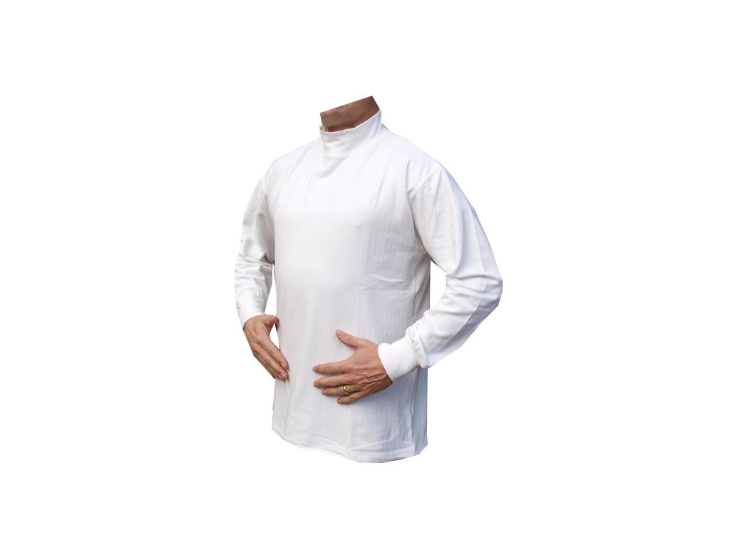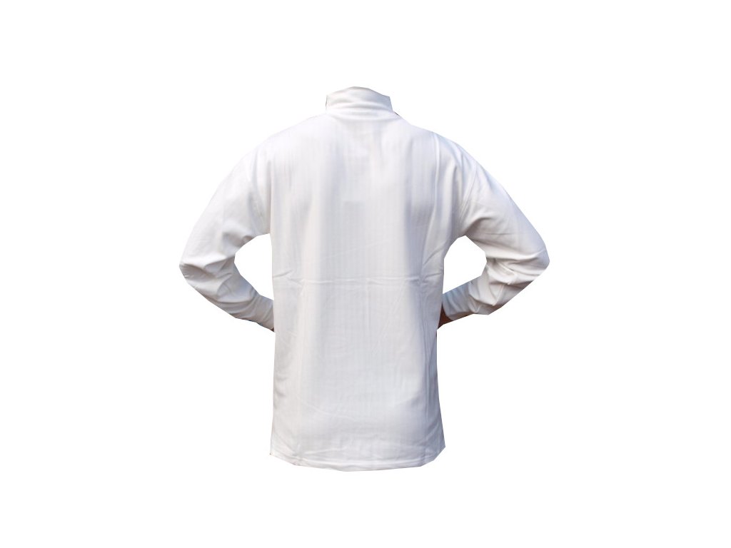 Tričko s dlouhým rukávem ukončené náplety se stojáčkem o velikosti cca 3,5cm je vyrobeno z 65% bavlny a 35 % příměs je barvy bílé. Z vnitřní strany trička je jemný vyteplený vlásek, vhodný pro chladnější období.