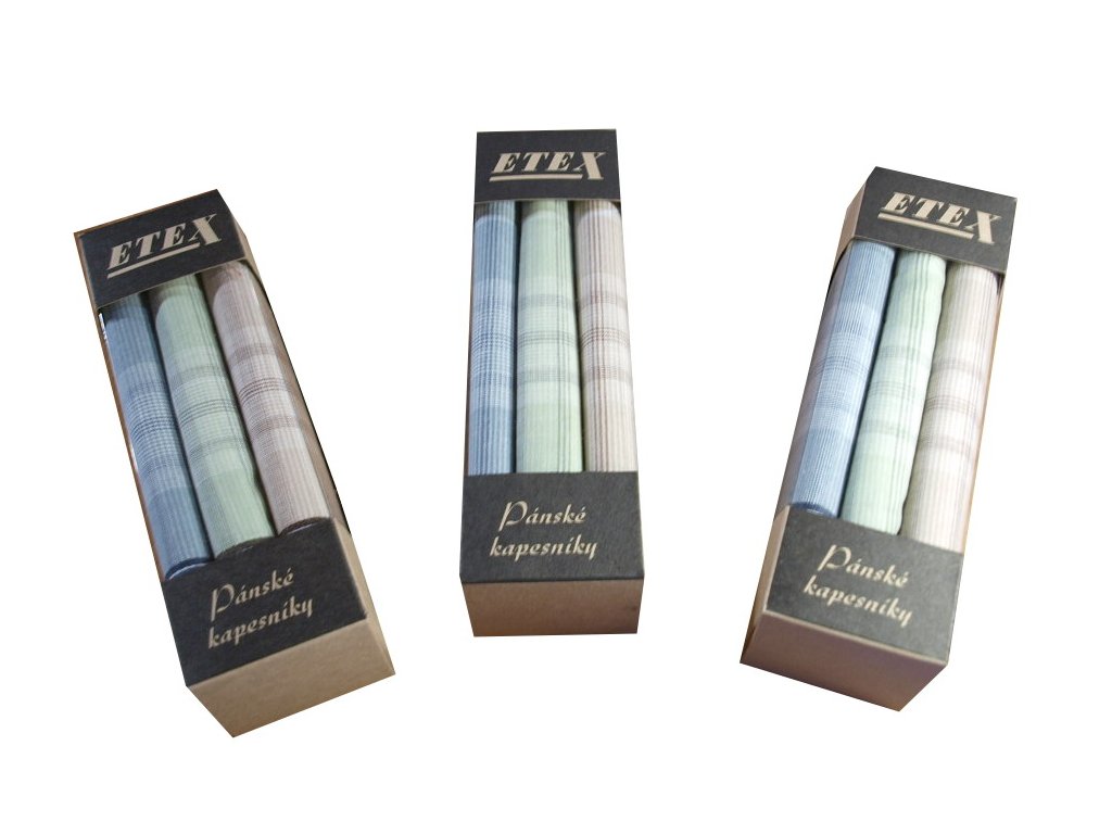 Pánské bavlněné kapesníky klasické české výroby jsou balené v dárkové krabičce po třech kusech. Rozměry krabičky 15 x 4,5 x 4,5 cm. Kapesníky jsou klasické pánské velikosti cca 40cm x 40cm a vyrobeny ze 100% česané bavlny.