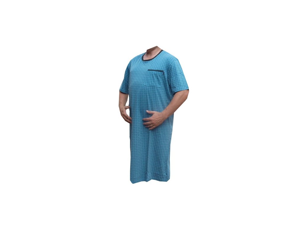 Noční košile pánská s krátkým rukávem barvy tyrkysové s drobným vzorem, je vyrobena z velice příjemného materiálu 100% bavlna. Košile má výstřih u krku do O a na levé horní straně kapsičku.