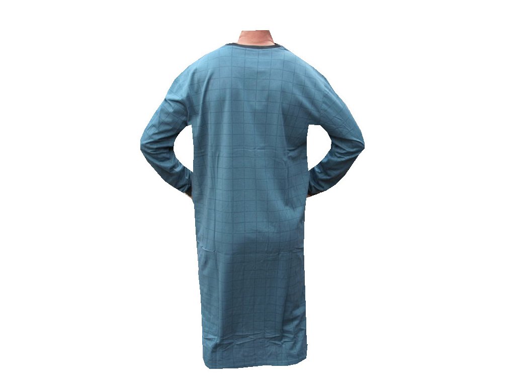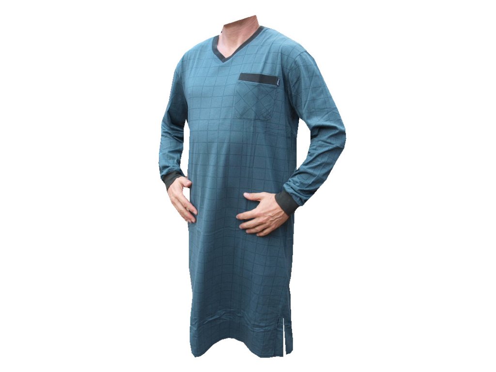 Noční košile pánská s dlouhým rukávem barvy tmavě zelené se vzorem, je vyrobena z velice příjemného materiálu 100% bavlna. Košile má výstřih u krku do V a na levé horní straně kapsičku, ukončení rukávů je do nápletů. Doporučená teplota údržby je 40C.