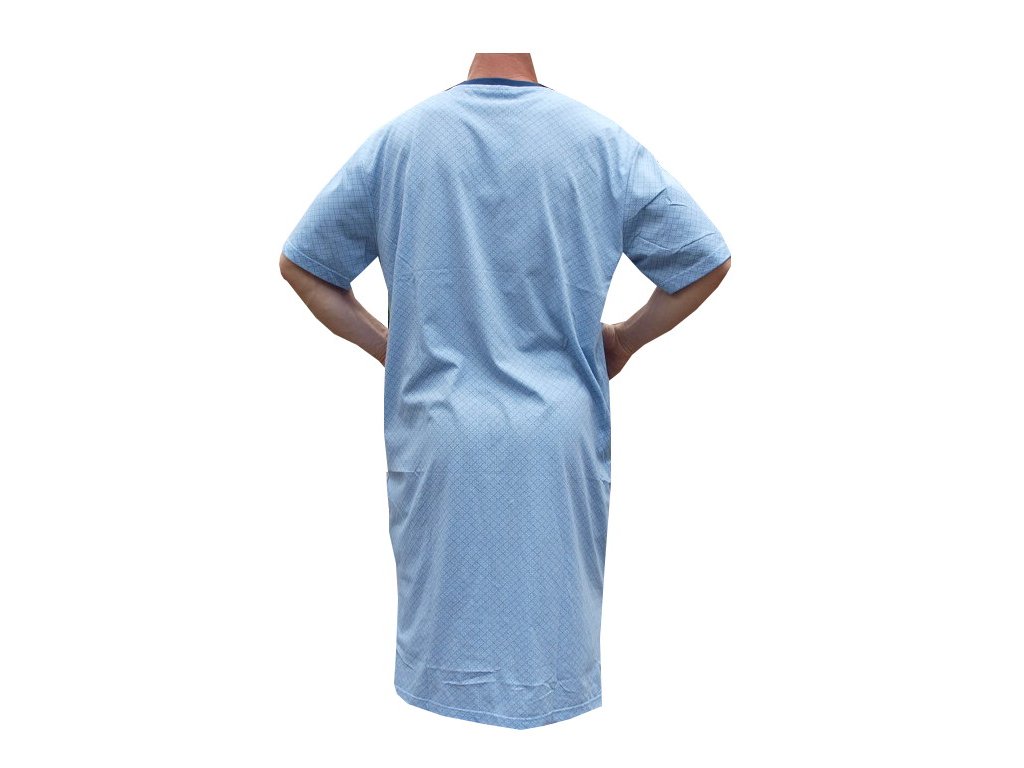 Noční košile pánská s krátkým rukávem barvy světle modré s drobným vzorem, je vyrobena z velice příjemného materiálu 100% bavlna. Košile má výstřih u krku do V a na levé horní straně kapsičku.