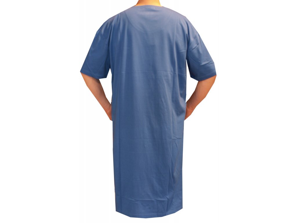 Noční košile pánská s krátkým rukávem barvy modré, je vyrobena z velice příjemného materiálu 100% bavlna. Košile má výstřih u krku do V a na levé horní straně kapsičku.