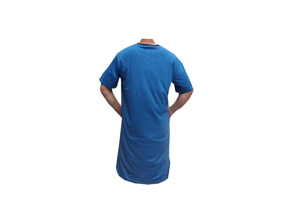 Noční košile pánská s krátkým rukávem barvy modré s drobným vzorečkem, je vyrobena z velice příjemného materiálu 100% bavlna. Košile má výstřih u krku do V a na levé horní straně kapsičku.