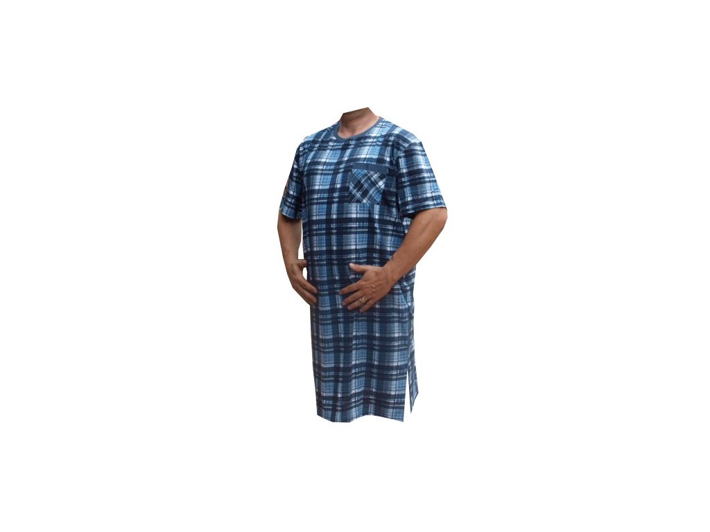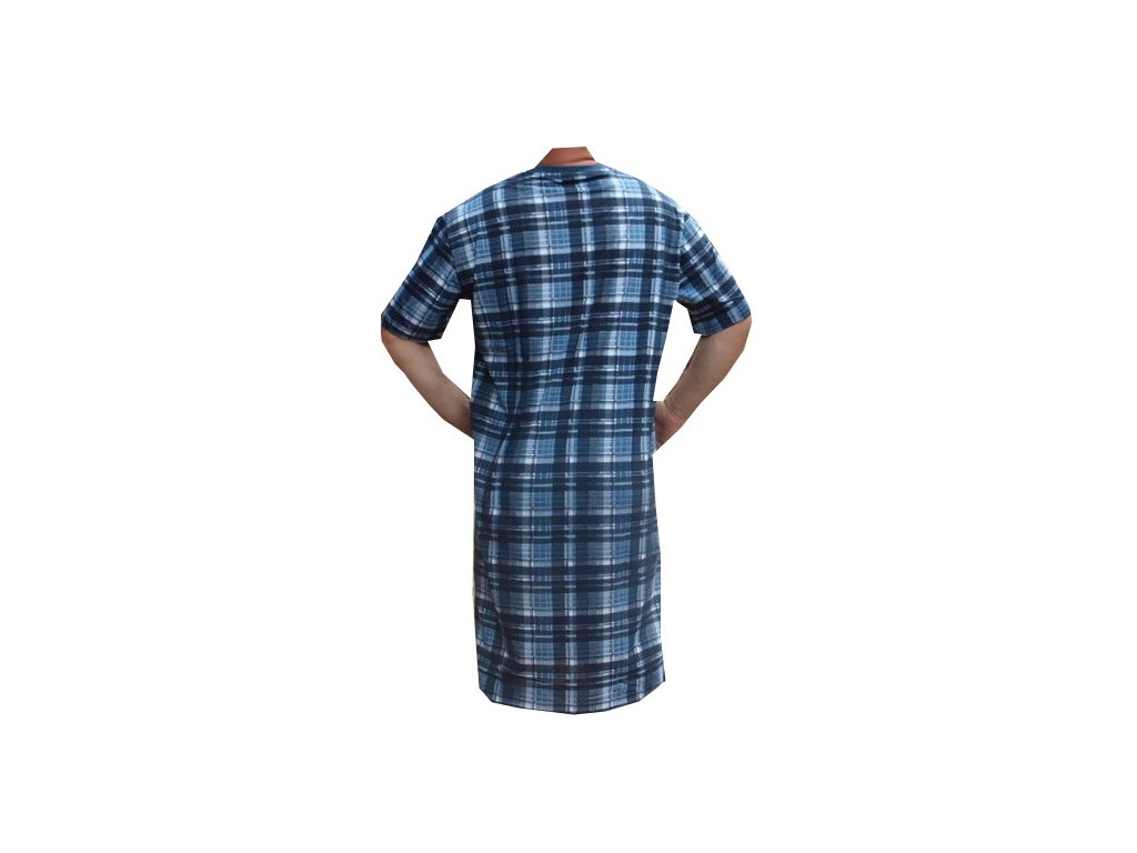 Noční košile pánská s krátkým rukávem barvy modré se vzorem, je vyrobena z velice příjemného materiálu 100% bavlna. Košile má výstřih u krku do O a na levé horní straně kapsičku.