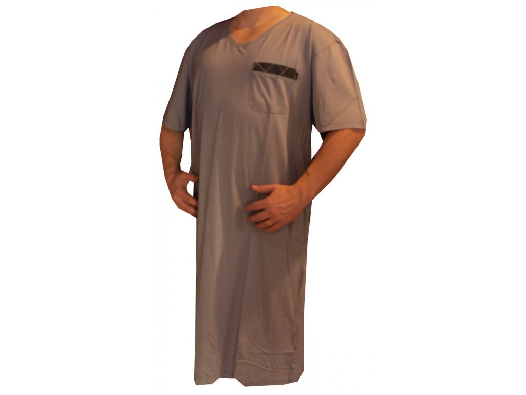 Noční košile pánská s krátkým rukávem barvy šedé, je vyrobena z velice příjemného materiálu 100% bavlna. Košile má výstřih u krku do V a na levé horní straně kapsičku.