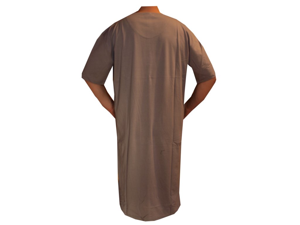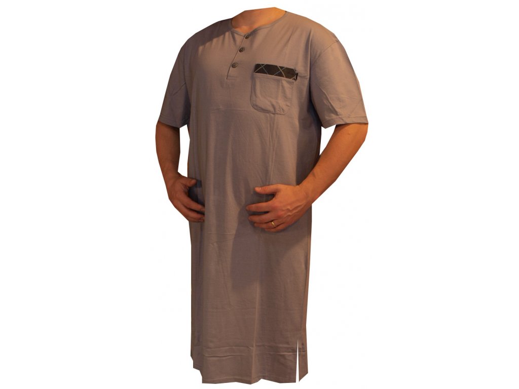 Noční košile pánská s krátkým rukávem barvy světle šedá, je vyrobena z velice příjemného materiálu 100% bavlna. Košile má výstřih u krku do O se třemi knoflíčky a na levé horní straně kapsičku.