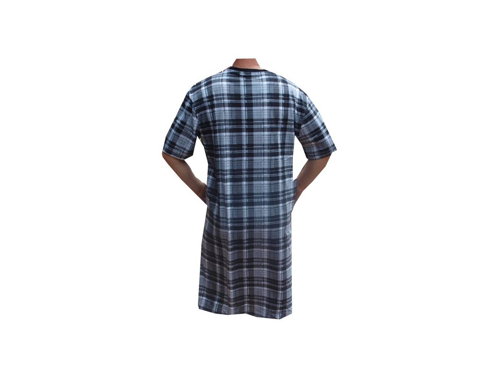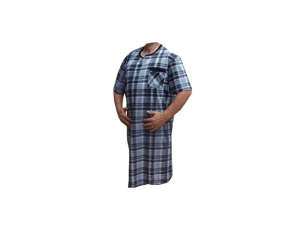 Noční košile pánská s krátkým rukávem barvy tmavé se vzorem, je vyrobena z velice příjemného materiálu 100% bavlna. Košile má výstřih u krku do O a na levé horní straně kapsičku.